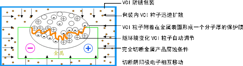 VCI是英文(Volatile Corrosion Inhibitor)的縮寫,它是一種具有揮發(fā)性的腐蝕抑制劑,簡稱為氣化性防銹產(chǎn)品。當(dāng)用氣化性防銹產(chǎn)品包裝好被包裝物以后,防銹產(chǎn)品的防銹粒子氣化成氣體,吸附在金屬表面形成保護(hù)膜,切斷金屬離子與水、氧氣接觸的可能性,有效抑制了金屬腐蝕電化學(xué)反應(yīng)的發(fā)生,從而達(dá)到防銹效果。包裝后內(nèi)部的防銹粒子的氣化擴(kuò)散量自動(dòng)調(diào)節(jié),當(dāng)濕度或溫度增大時(shí),防銹粒子的擴(kuò)散量也會(huì)加大, 反之,防銹粒子的擴(kuò)散量會(huì)減小,從而來自動(dòng)調(diào)節(jié)包裝物內(nèi)部的氣體濃度,讓包裝物始終處于一種最穩(wěn)定的防銹狀態(tài)。
